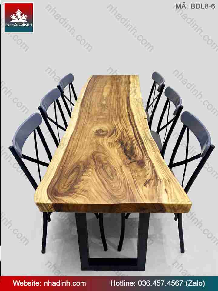 Bàn 6 Ghế Gỗ Me Tây Nguyên Khối dài 2080 rộng 600-600-680 dày 55 (mm)