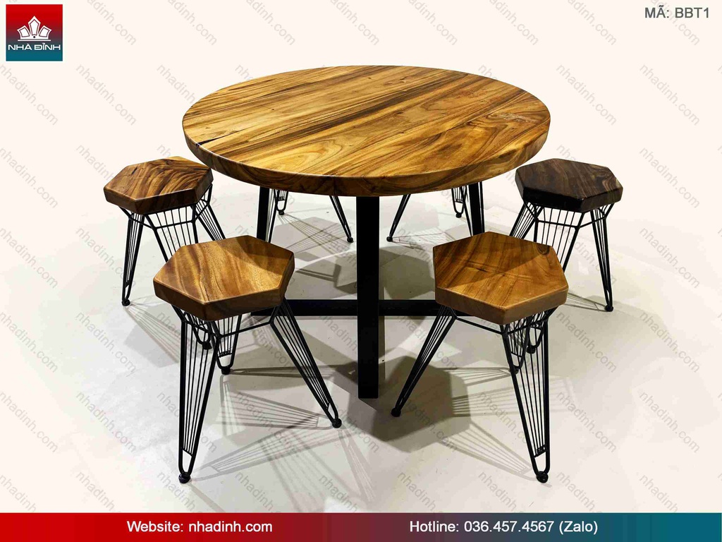 Bàn Tròn Gỗ Me Tây Mặt Ghép Và 6 Ghế Đẩu Đường Kính 100 Dày 5 (cm)