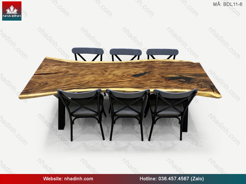 Bộ bàn ăn gỗ Me Tây 6 ghế trên là dạng hình bàn dài tự nhiên, kết hợp với chân sắt chữ X, mang lại cảm giác hiện đại, mới mẻ và hoành tráng cho phòng bếp nhà bạn.