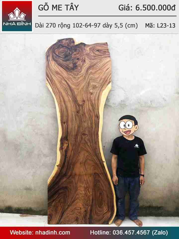 Mặt Bàn Ăn Gỗ Me Tây Nguyên Khối Dài 270 Rộng 102-64-97 Dày 5.5 (cm)