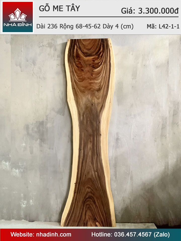 Mặt Bàn Gỗ Me Tây Nguyên Khối Dài 236 Rộng 68-45-62 Dày 4 (cm)