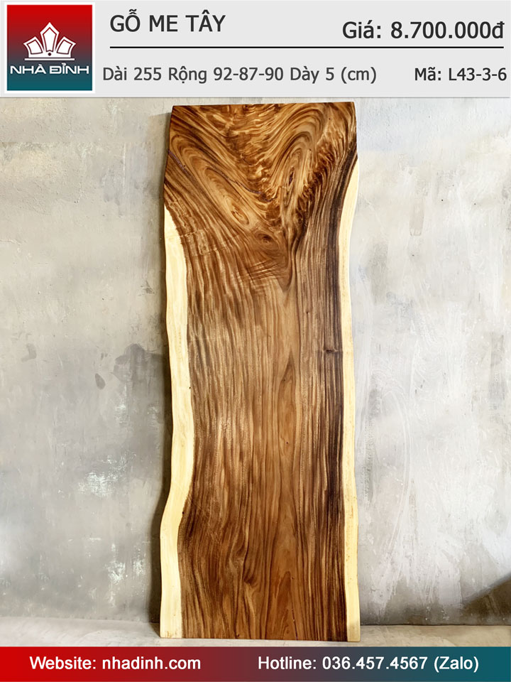Mặt Bàn Gỗ Me Tây Nguyên Khối Dài 255 Rộng 90-87-89 dày 5 (cm)
