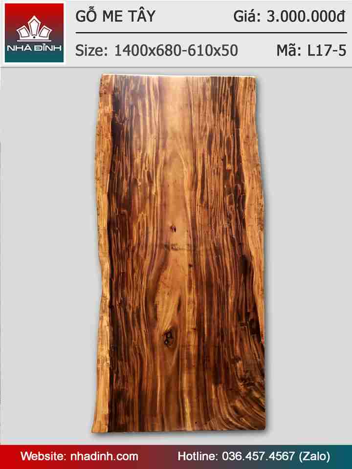 Mặt bàn gỗ Me Tây nguyên khối dài 1400 rộng 680-610 dày 50 (mm)