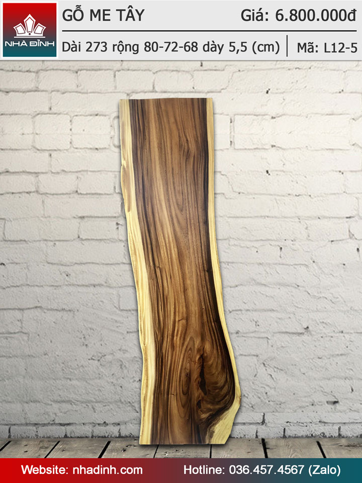 Mặt bàn gỗ Me Tây nguyên khối dài 273 rộng 80-72-68 dày 5,5 (cm)