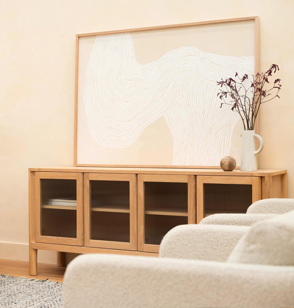 Chất liệu: Gỗ Sồi (Oak)_18% + Gỗ Cao Su Veneer Sồi_82% + Kính sọc mài