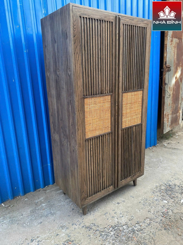 Tủ Quần Áo Gỗ Cao Su Veneer Sồi Cánh Kết Hợp Mây